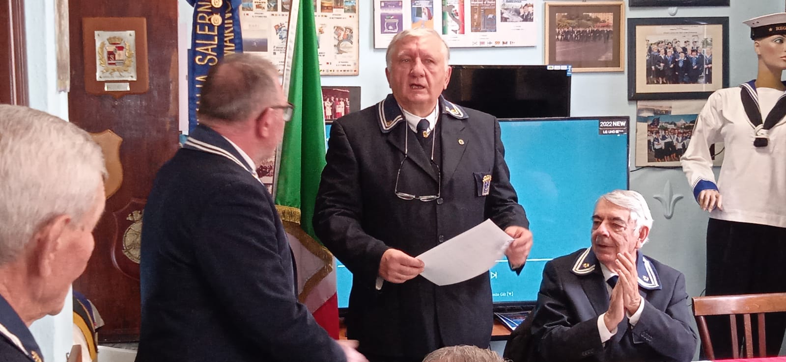 Il Presidente del Gruppo Anmi di Salerno LGT Giuseppe Palatucci dopo l’ esecuzione dell’ inno di Mameli ha raccontato la gestione dell’ anno trascorso nonchè una breve descrizione delle attività associativa in corso. ( Anmi porte aperte; Forzamento porto di Alessandria d’ Egitto; XX| Raduno Nazionale Anmi di Pisa previsto per maggio 2023; etc ).